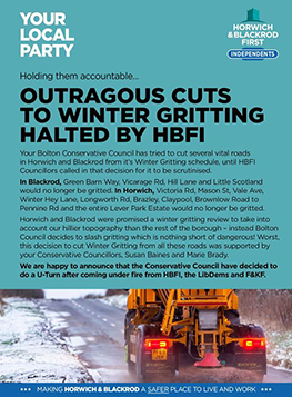Your Bolton Conservative Council has tried to cut several vital roads in Horwich and Blackrod from its Winter Gritting schedule until HBFI Councillors called in that decision for it to be scrutinised. In Blackrod, Green Barn Way, Vicarage Rd, Hill Lane and Little Scotland would no longer be gritted. In Horwich, Victoria Road, Mason Street, … [Read more…]